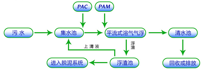 经加药反应后的污水进入气浮的混合区,与释放后的溶气水混合接触,使絮凝体粘附在细微气泡上体,然后进入气浮区。絮凝体在气浮力的作用下浮向水面形成浮渣,下层的清水经集水器流至清水池后,一部分回流作溶气使用,剩余清水通过溢流口流出。气浮池水面上的浮渣积聚到有些厚度以后,由刮沫机刮入气浮机污泥池后排出。